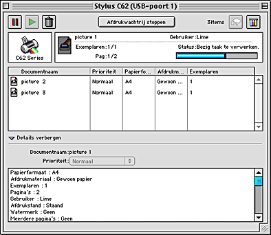 Nadat u een afdruktaak naar de printer hebt gestuurd, kunt u met behulp van het hulpprogramma EPSON Monitor3 afdruktaken die in de wachtrij staan, bekijken, annuleren of van volgorde wijzigen. Het hulpprogramma toont bovendien de status van de huidige afdruktaak.