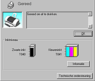 Dit venster geeft de voortgang van de huidige afdruktaak aan en bevat informatie over de printerstatus wanneer communicatie in twee richtingen tussen de printer en de computer tot stand is gebracht. In dit venster verschijnen bovendien foutberichten en nuttige tips voor het afdrukken. Raadpleeg het betreffende gedeelte hierna.
