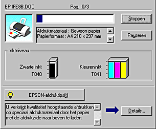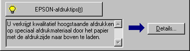 In het tekstvak onderaan het venster van de voortgangsbalk worden tips weergegeven voor een optimaal gebruik van uw EPSON-printersoftware. Er verschijnt een nieuwe tip om de 30 seconden. Als u meer informatie wilt over een tip die wordt weergegeven, klikt u op Details.