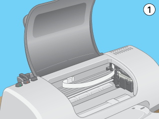Druk op de knop voor vervanging van de cartridge. De printkop gaat naar de positie waar de cartridge kan worden vervangen (het midden), het Aan-/uit-lampje begint te knipperen en het foutlampje begint te knipperen of gaat branden. Zie De knoppen op het bedieningspaneel van de printer gebruiken of controleer in EPSON Status Monitor 3 (voor Windows) of EPSON StatusMonitor (voor Macintosh) welke cartridge toe is aan vervanging.