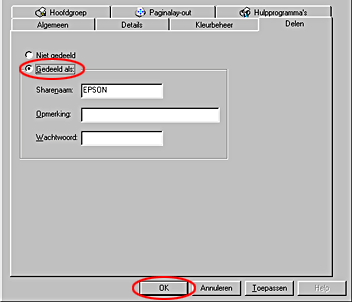 Selecteer Gedeeld als (Shared As), voer de printergegevens in en klik op OK.