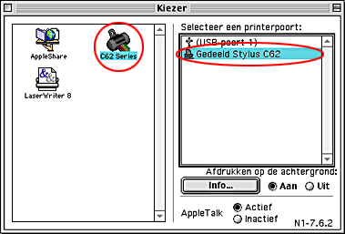 Kies in het Apple-menu de Kiezer (Chooser) en klik op het pictogram van de printer. Selecteer vervolgens de poort waarop de printer is aangesloten.