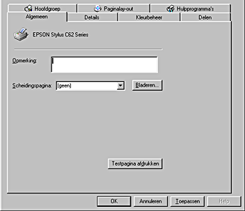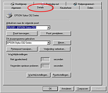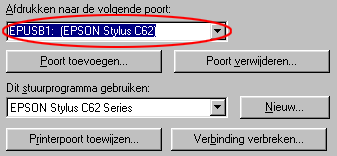 Als EPUSBx: (EPSON Stylus C62) wordt weergegeven in de keuzelijst Afdrukken naar de volgende poort (Print to the following port), dan zijn de printerdriver voor de USB-printer en de printersoftware goed geïnstalleerd. Als de juiste poort niet is geïnstalleerd, gaat u door met de volgende stap.