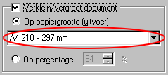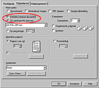 Schakel het selectievakje Verklein/vergroot document in en selecteer Op papiergrootte (uitvoer) op het tabblad Paginalay-out (Windows).