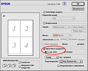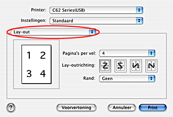 Voor Macintosh: schakel in het dialoogvenster voor de lay-out het selectievakje Meerdere pagina's in en selecteer x-op-één.