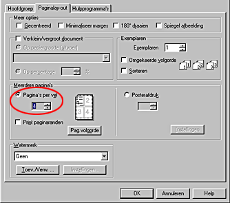 Hiermee worden meerdere pagina's van uw document afgedrukt op één vel papier. U kunt kiezen uit 1, 2, 4, 6, 9 en 16. |