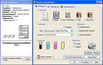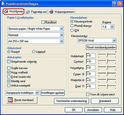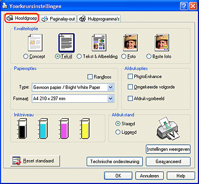 Via het tabblad Hoofdgroep kunt u de instellingen vastleggen voor Kwaliteitoptie, Papieropties, Afdrukopties, Afdrukstand en een aantal geavanceerde instellingen. Ook kunt u hier de inktniveaus controleren. Raadpleeg het betreffende gedeelte hierna.