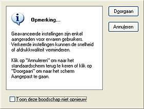 Hiermee worden op het tabblad onmiddellijk de geavanceerde instellingen weergegeven wanneer u het tabblad Hoofdgroep van de printersoftware opent.