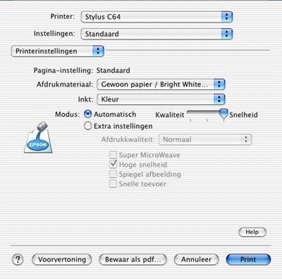 Hiermee schakelt u het bidirectioneel afdrukken in. Dit wil zeggen dat de printer zowel van links naar rechts als van rechts naar links afdrukt. Met Hoge snelheid wordt sneller afgedrukt, maar wel met een lagere kwaliteit.