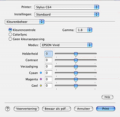 Als u in het venstermenu Kleurenbeheer selecteert, kunt u de kleuraanpassing en correctiemethoden van de printerdriver instellen. Met deze instellingen kunt u nieuwe afdrukideeën uitproberen of een reeks afdrukinstellingen op uw behoeften afstemmen. Als u tevreden bent met uw nieuwe instellingen, kunt u ze toevoegen aan de lijst Aangepaste instellingen van het afdrukvenster.