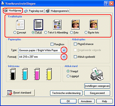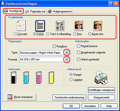 Klik op het tabblad Hoofdgroep en geef de gewenste instelling op bij Kwaliteitoptie. Raadpleeg het hierna genoemde gedeelte voor meer informatie over de instellingen voor Kwaliteitoptie.