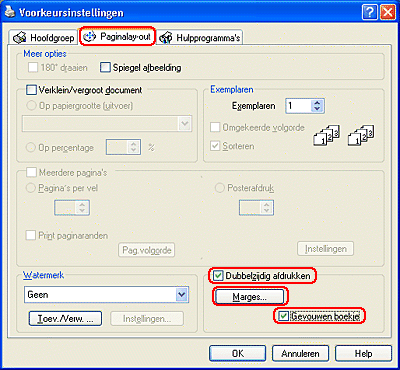 Schakel het selectievakje Dubbelzijdig afdrukken in. Schakel vervolgens het selectievakje Gevouwen boekje in.