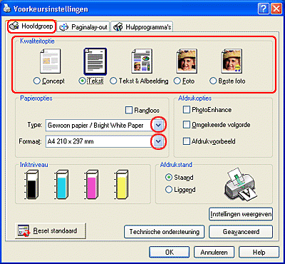 Klik op het tabblad Hoofdgroep en geef de gewenste instelling op bij Kwaliteitoptie. Raadpleeg het hierna genoemde gedeelte voor meer informatie over de instellingen voor Kwaliteitoptie. Zie Kwaliteitoptie