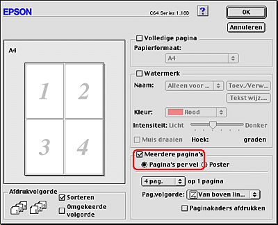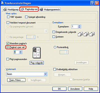 Hiermee worden twee of vier pagina's van uw document afgedrukt op één vel papier. |