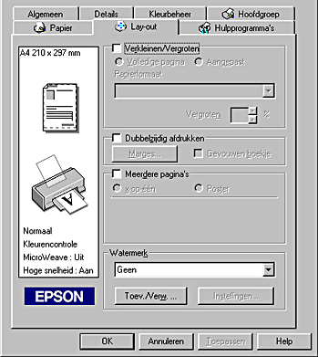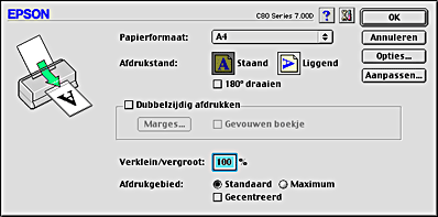 De EPSON Stylus C80/C70 kan beide zijden van het afdrukmateriaal bedrukken. Er kan op twee manieren dubbelzijdig worden afgedrukt. Met de standaardinstelling kunt u de oneven pagina's eerst afdrukken. Wanneer deze pagina's zijn afgedrukt, legt u ze opnieuw in de printer zodat de even pagina's kunnen worden afgedrukt op de andere zijde van het papier. Met de instelling Gevouwen boekje kunt u enkel gevouwen boekjes maken. Raadpleeg Opties instellen op het tabblad Lay-out (voor Windows) of Opties instellen in het dialoogvenster voor de pagina-instelling (voor Macintosh) voor meer informatie over het maken van enkel gevouwen boekjes en de functie Dubbelzijdig afdrukken.