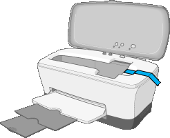 ![]() | Open de printerkap opnieuw. Plak de houder van de cartridges met plakband vast (zie afbeelding) en sluit de kap. |