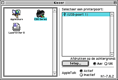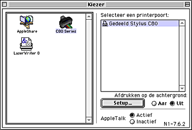 Kies in het menu Apple de Kiezer (Chooser) en klik op het pictogram van de printer. Selecteer vervolgens de poort waarop de printer is aangesloten.