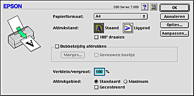 De EPSON Stylus C80/C70 kan beide zijden van het afdrukmateriaal bedrukken. Er kan op twee manieren dubbelzijdig worden afgedrukt. Met de standaardinstelling kunt u de oneven pagina's eerst afdrukken. Wanneer deze pagina's zijn afgedrukt, legt u ze opnieuw in de printer zodat de even pagina's kunnen worden afgedrukt op de andere zijde van het papier. Met de instelling Gevouwen boekje kunt u enkel gevouwen boekjes maken. Raadpleeg het betreffende gedeelte hierna.