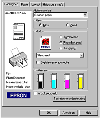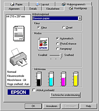 Met de opties voor Modus op het tabblad Hoofdgroep hebt u de beschikking over drie besturingsniveaus voor de printersoftware. Dit wordt hierna uitgelegd.