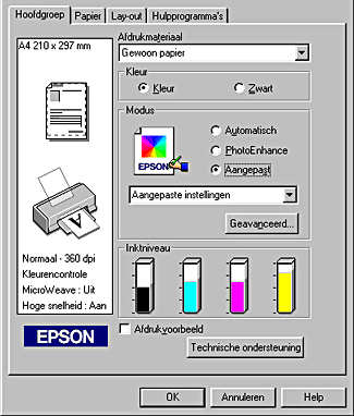 Als u een instelling selecteert voor Aangepast, worden andere opties, zoals Afdrukkwaliteit, Halftoning en Kleuraanpassing automatisch ingesteld. Wijzigingen in deze instellingen worden weergegeven in het schermpje aan de linkerkant van het tabblad Hoofdgroep.