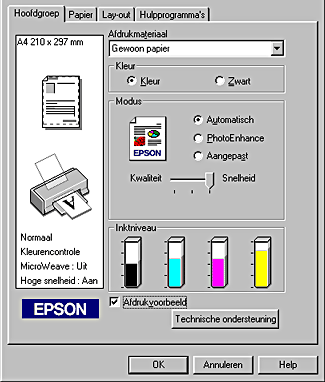Als u een afdruktaak naar de printer stuurt, wordt het venster EPSON-afdrukvoorbeeld geopend, zodat u wijzigingen kunt aanbrengen voordat de taak wordt afgedrukt.
