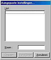 Als u uw geavanceerde instellingen wilt opslaan in de lijst Aangepaste instellingen, klikt u in het dialoogvenster Geavanceerd op Instellingen opslaan. Het dialoogvenster Aangepaste instellingen wordt dan weergegeven.