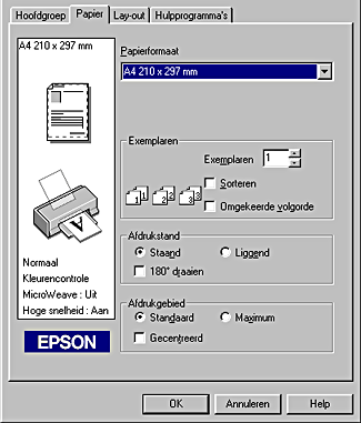 Met de opties op het tabblad Papier kunt u het papierformaat wijzigen, het gewenste aantal exemplaren en andere parameters voor de exemplaren instellen, de afdrukstand op het papier opgeven en het afdrukgebied aanpassen.
