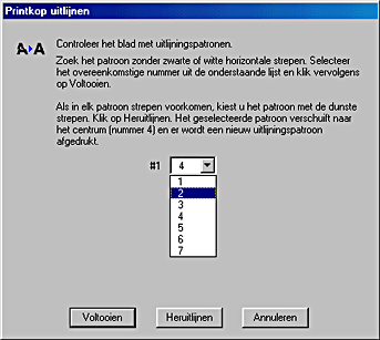 | Als alle patronen strepen vertonen, selecteert u het patroon met de minste strepen en klikt u vervolgens op Heruitlijnen. Het geselecteerde patroon komt nu in het midden en er wordt een nieuw testblad afgedrukt. |