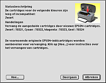 Als een cartridge (bijna) leeg is verschijnt de knop Hoe. Als u op de knop Hoe klikt, leidt EPSON StatusMonitor u stapsgewijs door de procedure voor het vervangen van de cartridge.