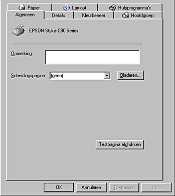Wanneer u Windows 2000 gebruikt, moet u de printersoftware installeren aan de hand van de stappen die staan beschreven op het blad Installatie dat bij de printer is geleverd. Anders kan het universele Microsoft-stuurprogramma worden geïnstalleerd. Ga als volgt te werk om te controleren of het universele stuurprogramma is geïnstalleerd.