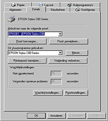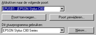 Als EPUSBx: (EPSON Stylus C80 of EPSON Stylus C70) wordt weergegeven in de keuzelijst Afdrukken naar de volgende poort (Print to the following port), dan zijn het stuurprogramma voor de USB-printer en de printersoftware goed geïnstalleerd. Als de juiste poort niet is geïnstalleerd, gaat u door met de volgende stap.