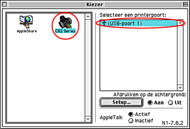 Kies in het Apple-menu de Kiezer (Chooser) en klik op het pictogram van de printer. Selecteer vervolgens de poort waarop de printer is aangesloten.