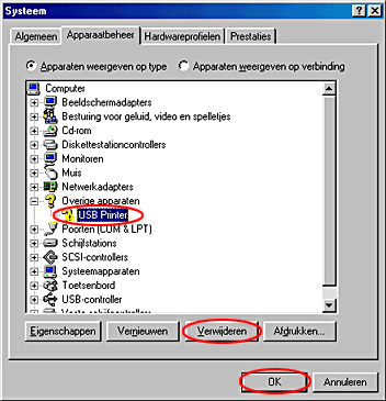 Als u in Windows Me of 98 de plug-and-play-installatie van de printerdriver hebt geannuleerd voordat de procedure was voltooid, is mogelijk de USB-printerdriver of de printersoftware onjuist geïnstalleerd. Volg de onderstaande aanwijzingen op om na te gaan of de printerdriver en de printersoftware op de juiste wijze zijn geïnstalleerd.