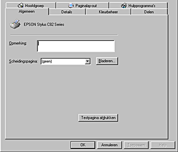 Als EPUSBx: (EPSON Stylus C82) wordt weergegeven in de keuzelijst Afdrukken naar de volgende poort (Print to the following port), dan zijn de printerdriver voor de USB-printer en de printersoftware goed geïnstalleerd. Als de juiste poort niet is geïnstalleerd, gaat u door met de volgende stap.