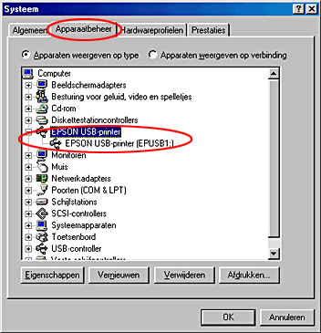 Als de drivers correct zijn geïnstalleerd, wordt EPSON USB-printer in Apparaatbeheer (Device Manager) weergegeven.