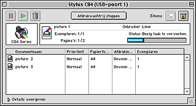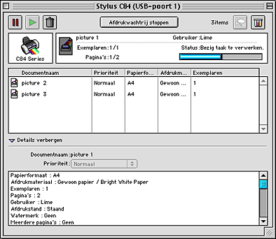 Nadat u een afdruktaak naar de printer hebt gestuurd, kunt u met behulp van het hulpprogramma EPSON MonitorIV afdruktaken die in de wachtrij staan bekijken, annuleren of in een andere volgorde zetten. Het hulpprogramma toont bovendien de status van de huidige afdruktaak.
