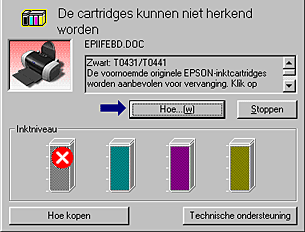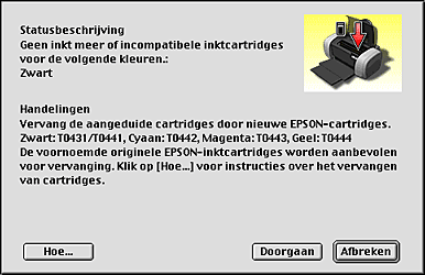 Als de inkt (bijna) op is, verschijnt onder het tekstvak een knop Hoe. Als u op Hoe klikt, wordt u door EPSON Status Monitor 3 stap-voor-stap begeleid bij de procedure voor het vervangen van de cartridge.