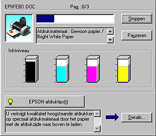 In het tekstvak onderaan het venster van de voortgangsbalk worden tips weergegeven voor een optimaal gebruik van uw EPSON-printersoftware. Er verschijnt een nieuwe tip om de 30 seconden. Als u meer informatie wilt over een tip die wordt weergegeven, klikt u op Details.