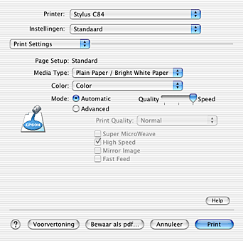 Hiermee schakelt u het bidirectioneel afdrukken in. Dit wil zeggen dat de printer zowel van links naar rechts als van rechts naar links afdrukt. Met Hoge snelheid wordt sneller afgedrukt, maar wel met een lagere kwaliteit.
