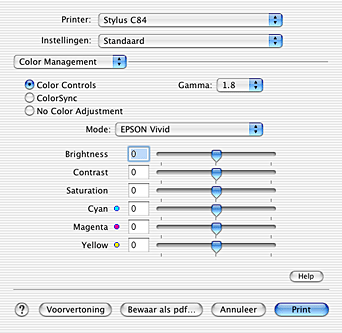 Als u in het venstermenu Kleurenbeheer selecteert, kunt u de kleuraanpassing en correctiemethoden van de printerdriver instellen. Met deze instellingen kunt u nieuwe afdrukideeën uitproberen of een reeks afdrukinstellingen op uw behoeften afstemmen. Als u tevreden bent met uw nieuwe instellingen, kunt u ze toevoegen aan de lijst Aangepaste instellingen van het afdrukvenster.