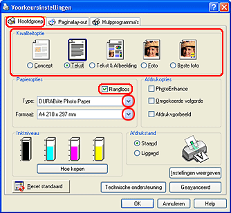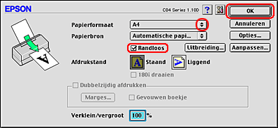 Na het laden van het afdrukmateriaal stelt u de printerdriver in op randloos afdrukken.