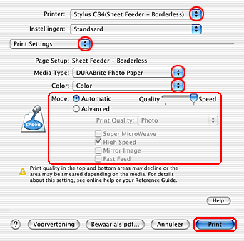 De instellingen voor Aantal en pagina's zijn de standaardinstellingen van Mac OS X. Raadpleeg de documentatie bij uw besturingssysteem voor meer informatie.