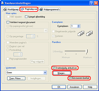 Klik op het tabblad Paginalay-out en schakel het selectievakje Dubbelzijdig afdrukken in. Schakel vervolgens het selectievakje Gevouwen boekje in.