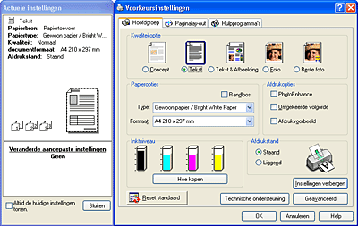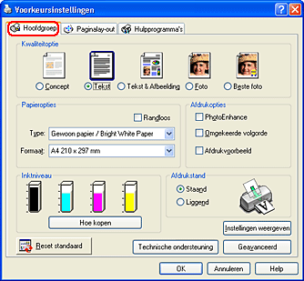 Via het tabblad Hoofdgroep kunt u de instellingen vastleggen voor Kwaliteitoptie, Papieropties, Afdrukopties, Afdrukstand en een aantal geavanceerde instellingen. Ook kunt u hier de inktniveaus controleren. Raadpleeg het betreffende gedeelte hierna.