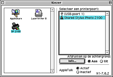 Kies in het Apple-menu de Kiezer (Chooser) en klik op het pictogram van de printer. Selecteer vervolgens de poort waarop de printer is aangesloten.