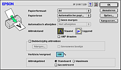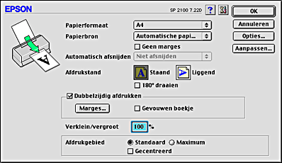 De EPSON Stylus Photo 2100 kan beide zijden van het afdrukmateriaal bedrukken. Er kan op twee manieren dubbelzijdig worden afgedrukt. Met de standaardinstelling kunt u de oneven pagina's eerst afdrukken. Wanneer deze pagina's zijn afgedrukt, legt u ze opnieuw in de printer zodat de even pagina's kunnen worden afgedrukt op de andere zijde van het papier. Met de instelling Gevouwen boekje kunt u enkel gevouwen boekjes maken. Raadpleeg het betreffende gedeelte voor instructies.