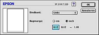 | De werkelijke rugmarge kan afwijken van de opgegeven instellingen. Dit hangt af van de toepassing waarmee u werkt. Probeer daarom eerst een paar vellen uit om te zien wat het resultaat zal zijn, voordat u de volledige afdruktaak afdrukt. |