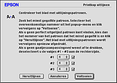 Als u geen enkel mooi effen patroon kunt vinden, selecteer dan het nummer van het patroon dat het minst korrelig overkomt en klik op Heruitlijnen. Het testblad wordt opnieuw afgedrukt. Als u een mooi effen patroon kunt selecteren en het testpatroon niet opnieuw hoeft af te drukken, schakel dan de selectievakjes #1 tot #3 aan de rechterzijde uit.