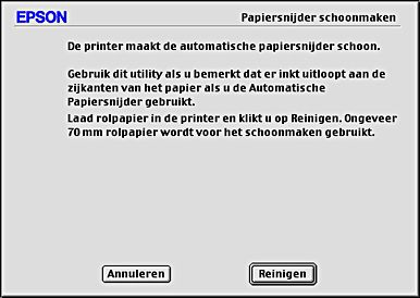 Met het hulpprogramma Snijmechanisme Reinigen wordt het mes van het snijmechanisme schoongemaakt. U moet het mes reinigen wanneer u bemerkt dat het uiteinde van een afgesneden pagina vlekken vertoont. Met dit hulpprogramma kunt u het snijmechanisme reinigen.
