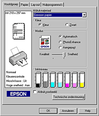 Met de opties voor Modus op het tabblad Hoofdgroep hebt u de beschikking over drie besturingsniveaus voor de printersoftware. Dit wordt hierna uitgelegd.